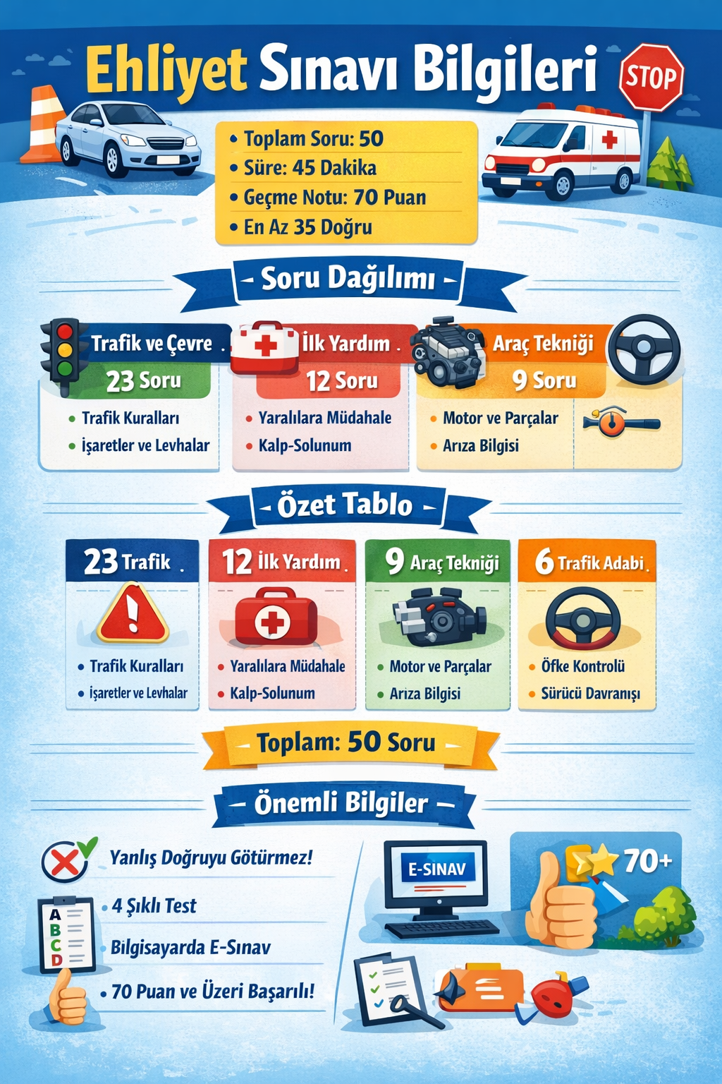 Ehliyet sınavı (yani e-sınav) Türkiye’de belirli bir sistemle hazırlanır ve toplam 50 sorudan oluşur. Ama sadece sayı değil, hangi konudan kaç soru geldiğini bilmek asıl önemli 👍